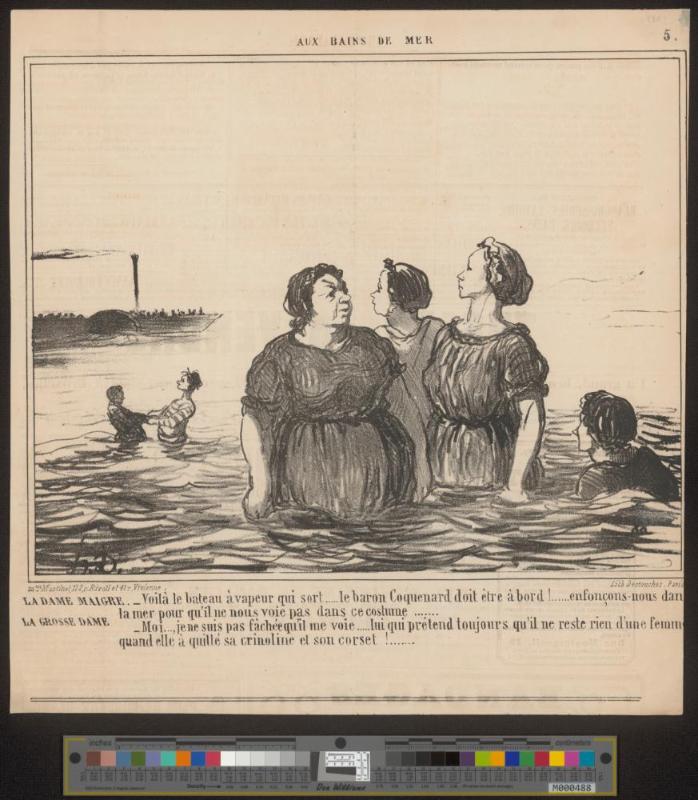La dame maigre: Voilà le bateau à vapeur qui sort.... le baron Coquenard doit être à bord!... enfonçons-nous dans la mer pour qu'il ne nous voie pas dans ce costume..... La grosse dame: Moi.... je ne suis pas fâchée qu'il me voie..... lui qui prétend toujours qu'il ne reste rien d'une femme quand elle a quitté sa crinoline et son corset!.....