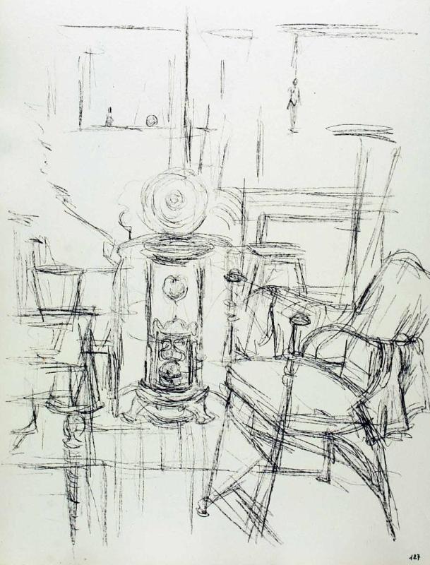 Wohnraum mit Tisch, Ofen und einem von Diego gemachten Sessel