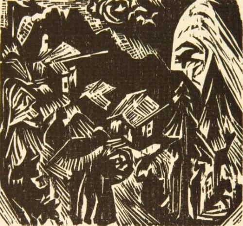 Illustration zum Gedicht „Spitzköpfig kommt er ...“ in Georg Heyms „Umbra Vitae. Nachgelassene Gedichte“ Seite 13