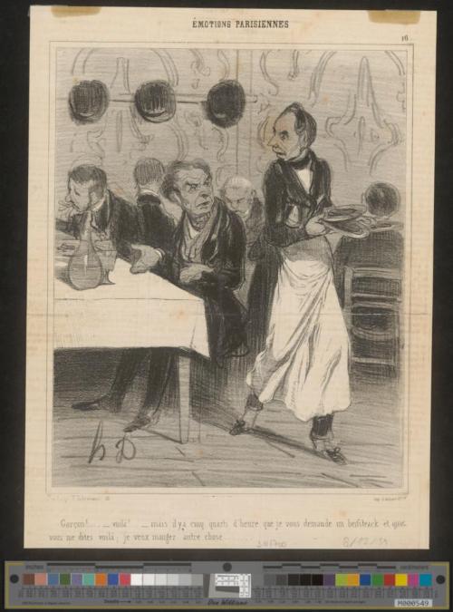 Garçon!.... - voilà!... - mais il y a cinq quarts d'heure que je vous demande un beifsteack et que vous me dites voilà, je veux manger autre chose...